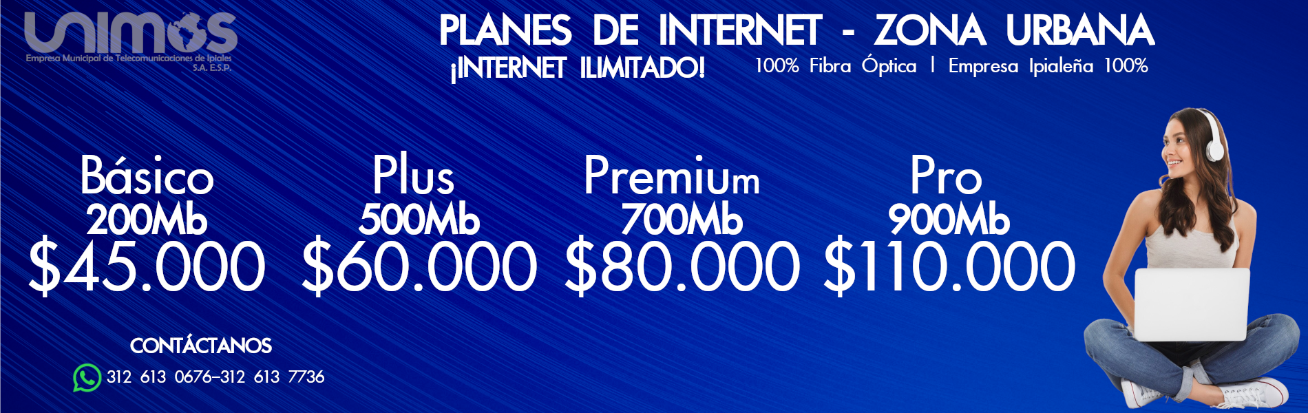 Con el Servicio de Internet de Unimos todos los recursos del ciberespacio están a su alcance de manera ágil y segura. Viva la red a gran velocidad: ahora puede enviar y recibir correos electrónicos, consultar todo tipo de información, conocer las noticias mundiales, chatear con sus amigos, jugar en línea, descargar todo tipo de archivos o realizar transacciones como: pagos virtuales, compras en línea y consultas.